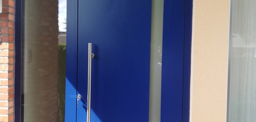 Het gaat hier om het MB-70 raamsysteem van Aluprof. De thermische en akoestische kwaliteiten van het MB-70 systeem thermische zijn uitstekend. Daarom is het systeem zeer geschikt voor allerlei types ramen, deuren, inkomhallen, etalages en ruimtelijke constructies. De opdrachtgever koos voor een mooi blauwe kleur (Ral 5002).