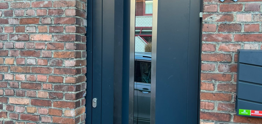 Thermospro leverde en monteerde voor deze woning in Sint-Katelijne-Waver een nieuwe aluminium voordeur. Deze is voorzien van een innox-afwerking aan de buitenzijde en van spiegelend glas.