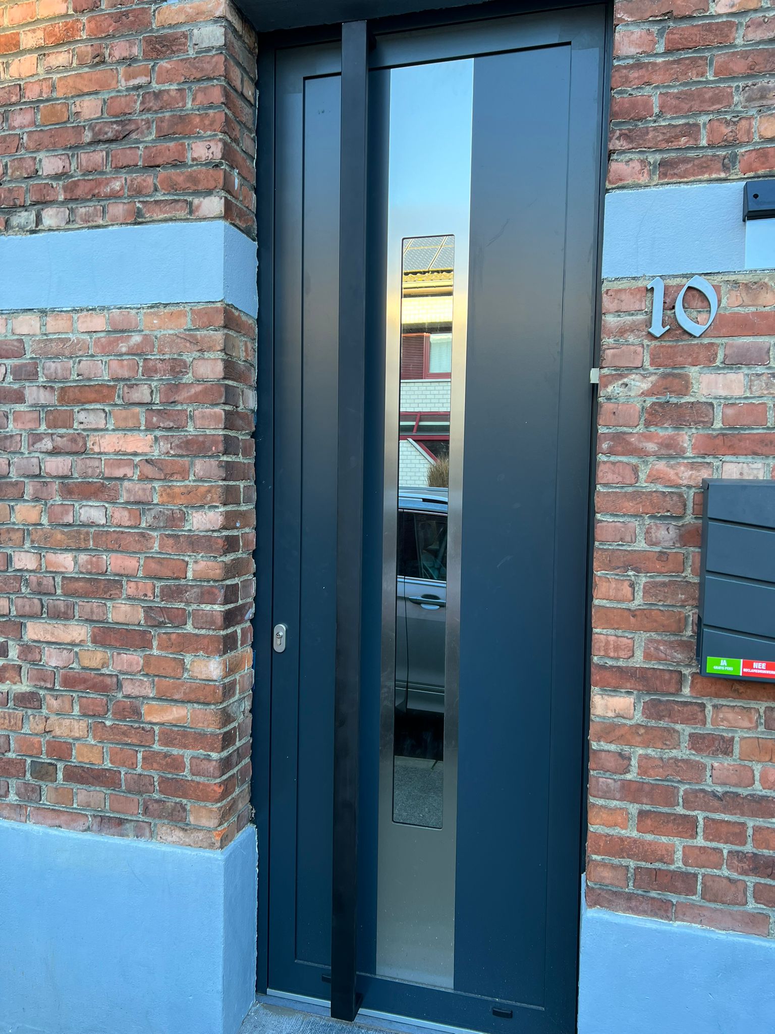 Thermospro leverde en monteerde voor deze woning in Sint-Katelijne-Waver een nieuwe aluminium voordeur. Deze is voorzien van een innox-afwerking aan de buitenzijde en van spiegelend glas.